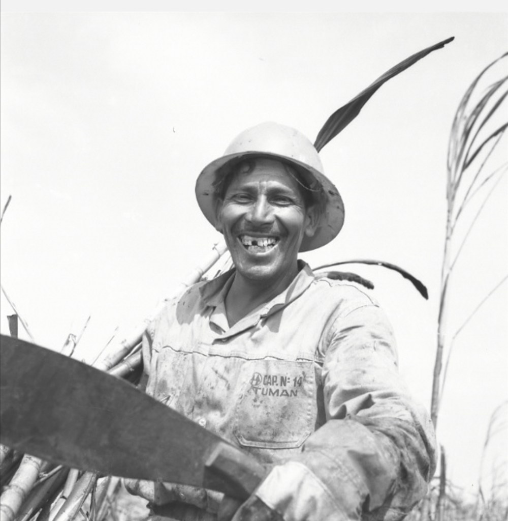 Esta imagen es preciosa, sencilla, pero también con esta sonrisa que nos habla de la pobreza, de los problemas de malnutrición en los trabajadores cañeros que tienen una labor muy difícil. Aquí el trabajador permite al fotógrafo que lo fotografíe; y él le entrega su alma con una sonrisa. Me parece genial este contrapicado, de ensalzar a este personaje.