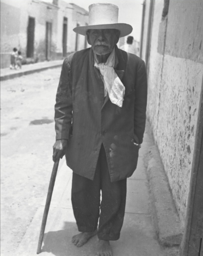 Retrato de toda la dignidad de este hombre en su pobreza, en sus pies descalzos, con su pañuelo al cuello, su sombrero impecable y su posición digna, en un poblado del norte del Perú.