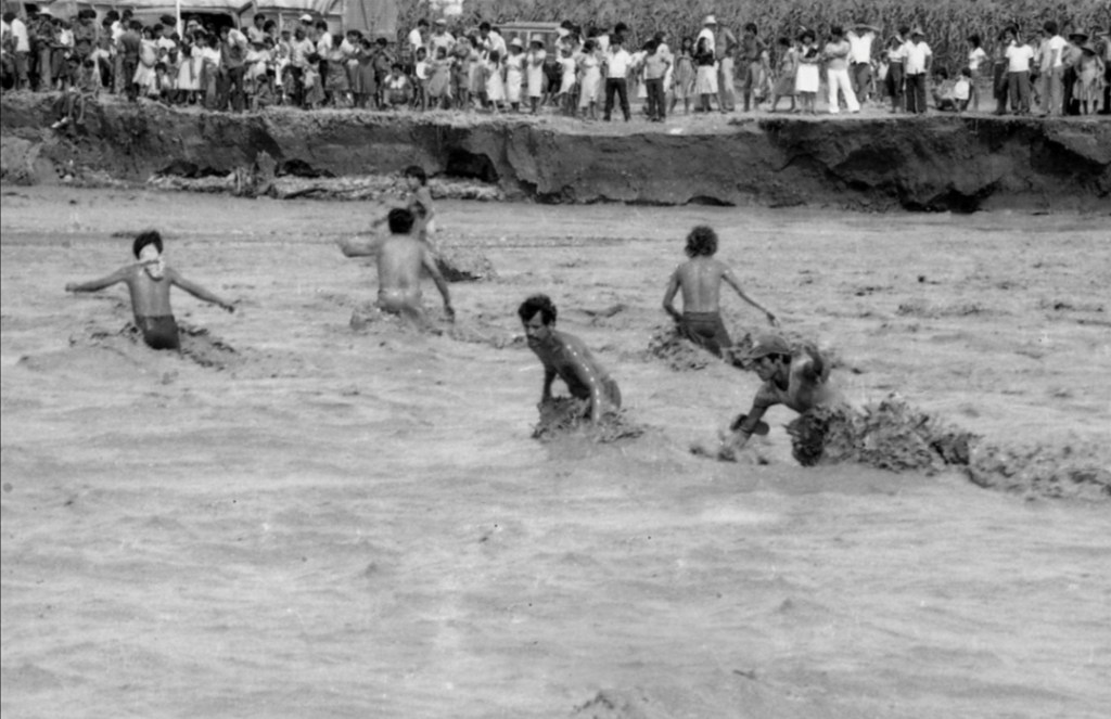 En el capítulo de inundaciones, me parece fascinante la cantidad de material de los Quiroga sobre las inundaciones en la región y de cómo los ciudadanos fueron resolviendo, salvando sus cosas, los momentos dramáticos que se viven cuando quieren cruzar de un lado a otro y el riesgo de vida que corren cuando la corriente de agua es potente. Hay muchas fotos donde la tensión, el suspenso, es atemporal y en la década que se vea siempre reflejará el riesgo de los personajes. Por el contrario, cuando estas inundaciones todavía están, los niños encuentran algo del placer de vivir en situaciones dramáticas. Allí están los Quiroga recogiendo estos momentos y Larcery editándolos y alternando estas fotografías con otras, a pesar de la situación dramática que se vive.