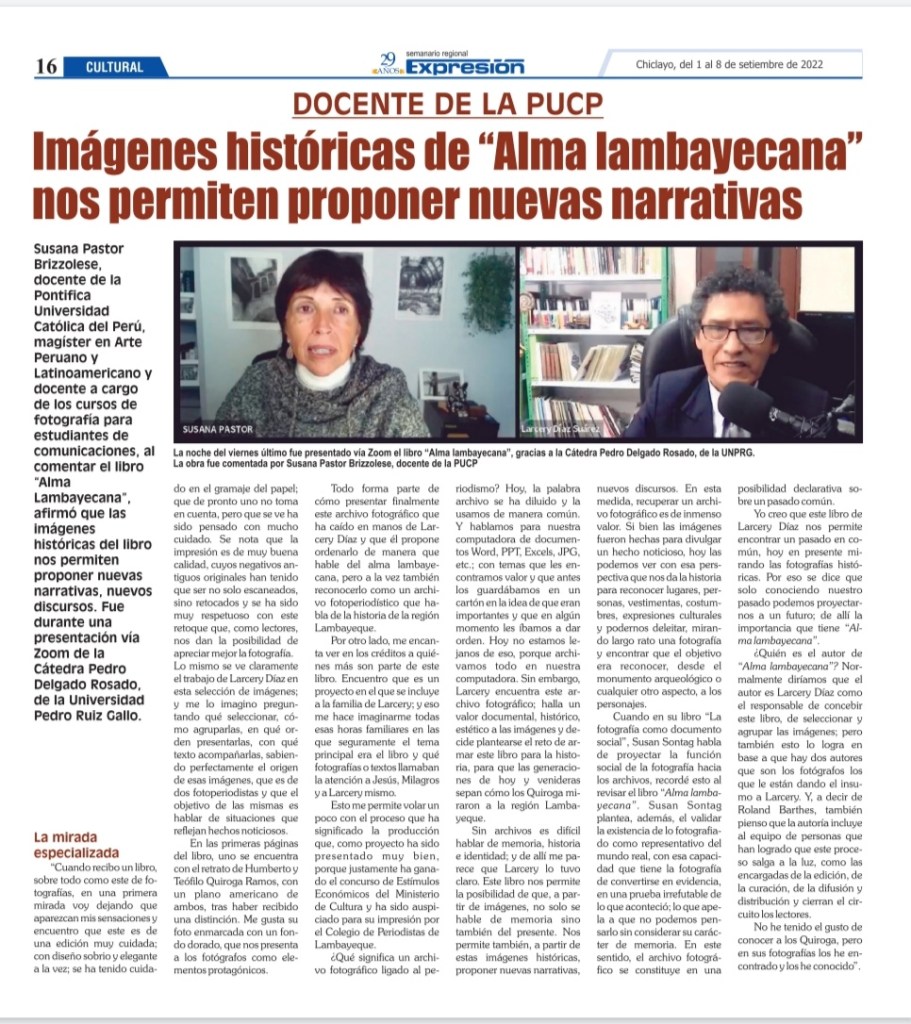 Susana Pastor Brizzolese, docente de la Pontifica Universidad Católica del Perú, magíster en Arte Peruano y Latinoamericano y docente a cargo de los cursos de fotografía para estudiantes de comunicaciones, al comentar el libro “Alma Lambayecana”, afirmó que las imágenes históricas del libro nos permiten proponer nuevas narrativas, nuevos discursos. Fue durante una presentación vía Zoom de la Cátedra Pedro Delgado Rosado, de la Universidad Pedro Ruiz Gallo.