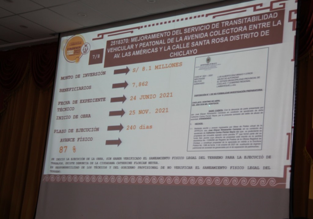 Durante su exposición, el gobernador también cuestionó el proyecto denominado “Mejoramiento del servicio de seguridad ciudadana en el distrito de Chiclayo”, para el que se ha proyectado un monto de inversión de 40.1 millones de soles. El expediente técnico comenzó el 1 de julio de 2022; pero, al parecer no existe la debida sostenibilidad para la realización del mencionado proyecto.