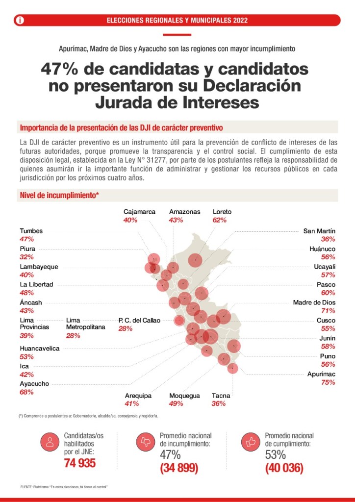 Al cierre del plazo establecido, se puede observar que solo 40 036 candidatos y candidatas (53%) a gobernadores, vicegobernadores y consejeros regionales, así como para alcaldes y regidores provinciales y distritales, cumplió con la responsabilidad de presentar su DJI, mientras que 34 899 (47%) aún no lo han concretado. De la información pública y disponible en la plataforma En estas elecciones, tú tienes el control, se puede observar los siguientes niveles de incumplimiento de acuerdo al cargo al que postulan las candidatas y candidatos: