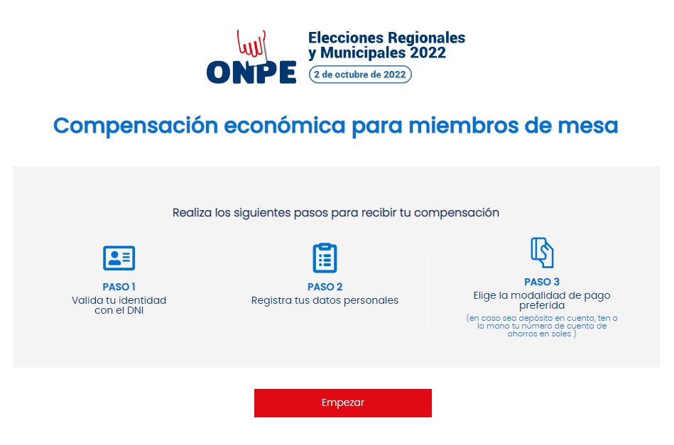 La Oficina Nacional de Procesos Electoral (ONPE) informa que desde hoy miércoles 5 de octubre abrió el registro en la página web https://pagomiembromesa.onpe.gob.pe/, para que los ciudadanos de la cola que ejercieron el cargo de miembro de mesa de mesa, por ausencia de los miembros de mesa sorteados, registren sus datos y puedan cobrar la compensación económica de S/ 120.00.