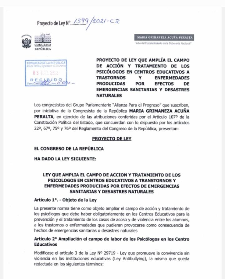 Respaldando el PL de la congresista Acuña Peralta, el Colegio de Psicólogos afirma que la incorporación de un psicólogo por colegio «es de vital importancia para el desarrollo e implementación de un sistema de salud mental y bienestar psicológico en las instituciones educativas, sistema que debe ser liderado por un experto en salud mental como es el profesional en psicología, generando espacios en prácticas profesionales en los colegios para los 150 mil estudiantes de psicología que se están formando en el 80% de universidades de nuestro país».