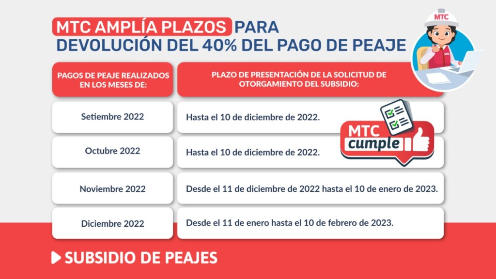 Asimismo, los pagos de peajes que se realicen en noviembre de 2022 se podrán presentar entre el 11 de diciembre de 2022 hasta el 10 de enero de 2023. En el caso de los pagos de diciembre, los plazos de presentación son desde el 11 de enero de 2023 hasta el 10 de febrero del mismo año.