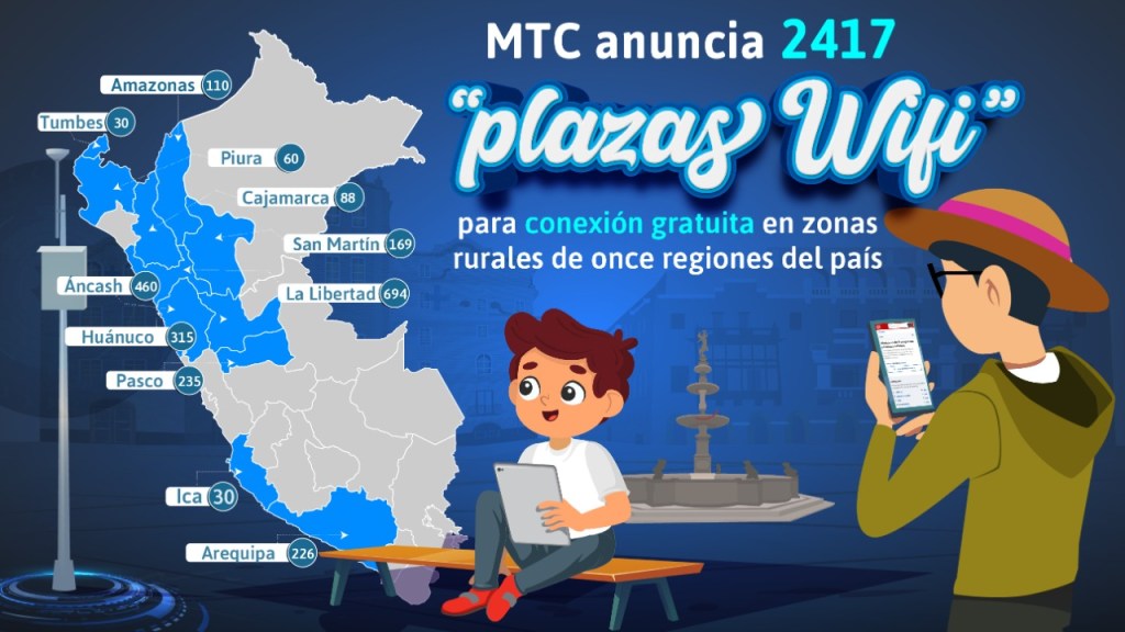 El Ministerio de Transportes y Comunicaciones (MTC) tiene en cartera la ejecución de 2417 puntos inalámbricos de internet, ubicados en espacios públicos de localidades rurales, conocidos como “plazas WiFi”, con el objetivo de reducir la brecha digital y acercar el servicio de Internet a lugares de preferente interés social.