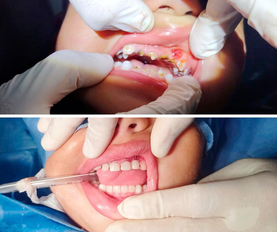 La coordinadora del servicio de Odontología y responsable del caso, Gaby Alarcón Pérez, explicó que al realizar la evaluación clínica se encontraron múltiples caries dentales con destrucción coronal total, remanente radicular (fragmentos de raíz dental que permanecen en la cavidad oral sin realizar ninguna función), tracto sinuoso (pus que destruye el hueso y el tejido gingival), gingivitis crónica, abscesos en el hueso maxilar y mandibular y tejido muerto necrótico e infectado.