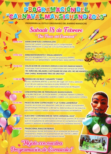 El Carnaval Mansichano 2023, denominado “La fiesta que nos une”, se desarrollará del 18 al 20 de febrero en el barrio “Mansiche”, del distrito de Ciudad Eten, en Chiclayo, con una serie de actividades donde los vecinos se fusionan en una contagiante celebración en la que se vive, baila, canta y derrocha alegría.