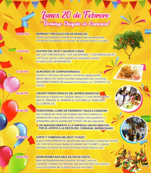 La fiesta continuará el día 19, con el “Domingo grande de carnaval”, en que habrá un pasacalle de danzas multicolor y corso de reinas y por la noche un baile; y concluirá el lunes 20, con el “Domingo chiquito de carnaval”, en el que por la mañana se vestirá el yunze; y por la tarde se desarrollarán juegos tradicionales del barrio Mansiche; será el corte y tumbada del yunze y finalmente se realizará un baile de fin de fiesta.