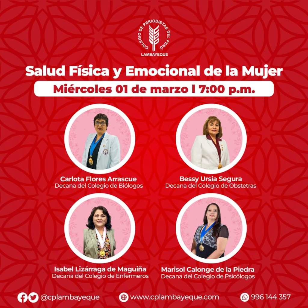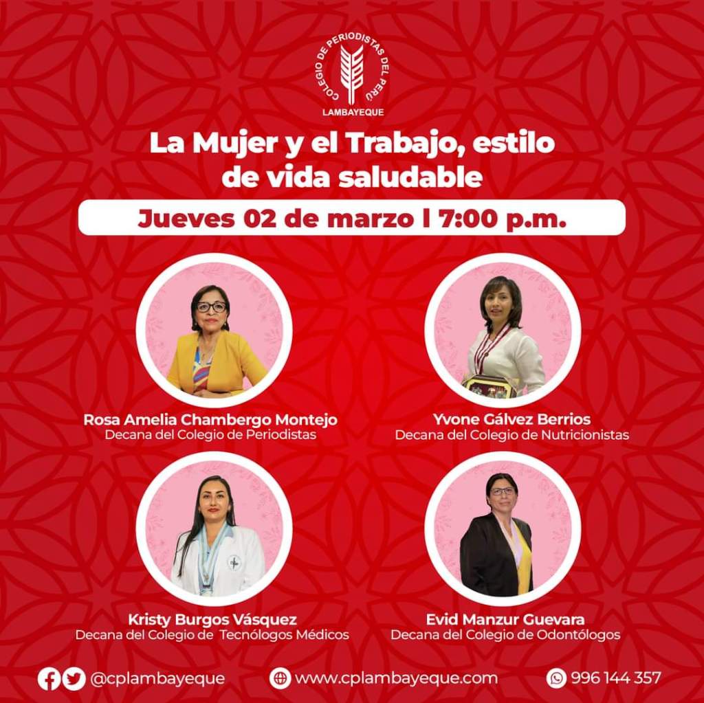 Por ello, el Consejo Directivo 2022 – 2023 del Colegio Departamental de Periodistas de Lambayeque invita a todos los profesionales lambayecanos, y al público en general a difundir este ciclo de paneles con las 12 decanas electas en nuestra región, sobre el tema «La importancia de la mujer en el desarrollo profesional.