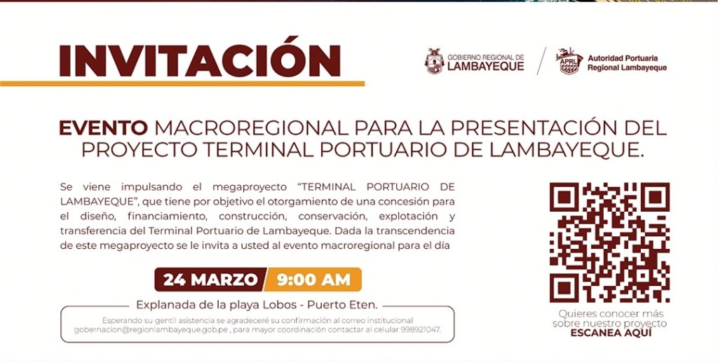 El evento macroregional denominado “Impulsando la infraestructura Portuaria multipropósito terminal portuario de Lambayeque para el mundo”, congregará a la presidenta de la República, ministros, Proinversión, gobernadores regionales de Lambayeque, Cajamarca, Amazonas, San Martin y Loreto, alcaldes, embajadores, representantes de la Sociedad Civil, inversionistas y empresarios.