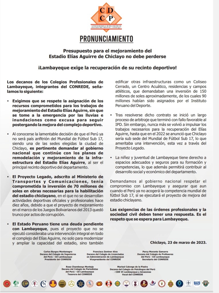 Tras conocerse la decisión de que Perú no será sede del Mundial de Fútbol Sub 17, como se había previsto, los decanos de los colegios profesionales de Lambayeque, pidieron que el presupuesto que estaba destinado para la rehabilitación del estadio Elías Aguirre de Chiclayo no se pierda y exigieron la recuperación de este recinto deportivo.