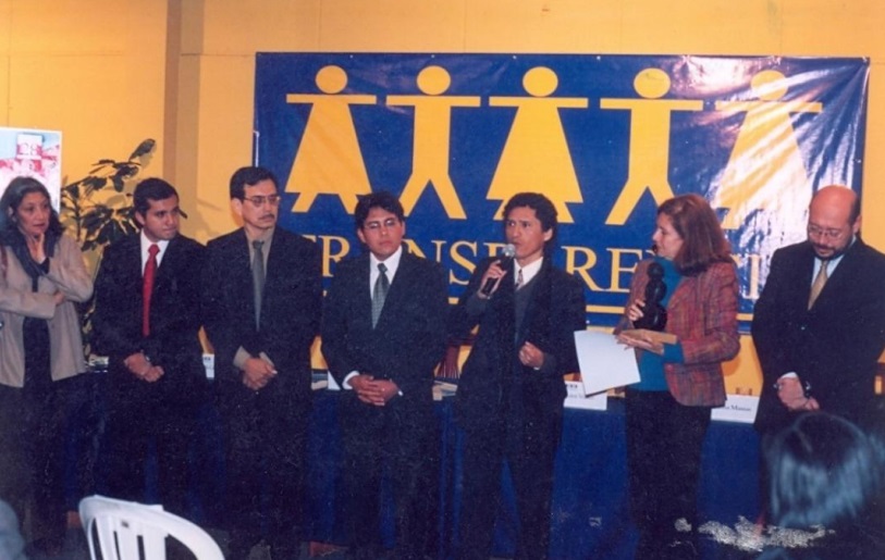 El periodista Larcery Díaz recibiendo el premio de la Asociación Civil Transparencia por su reportaje «Su nombre es del Perú».