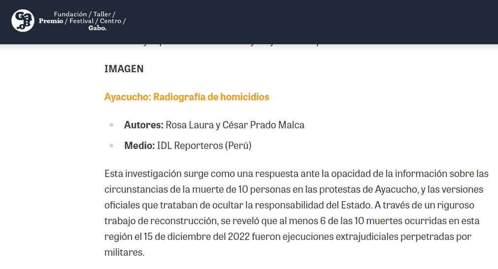 En 2023 el vídeo reportaje: “Ayacucho: radiografía de homicidios”, gana el premio de la Fundación Gabo, en la categoría de imagen.