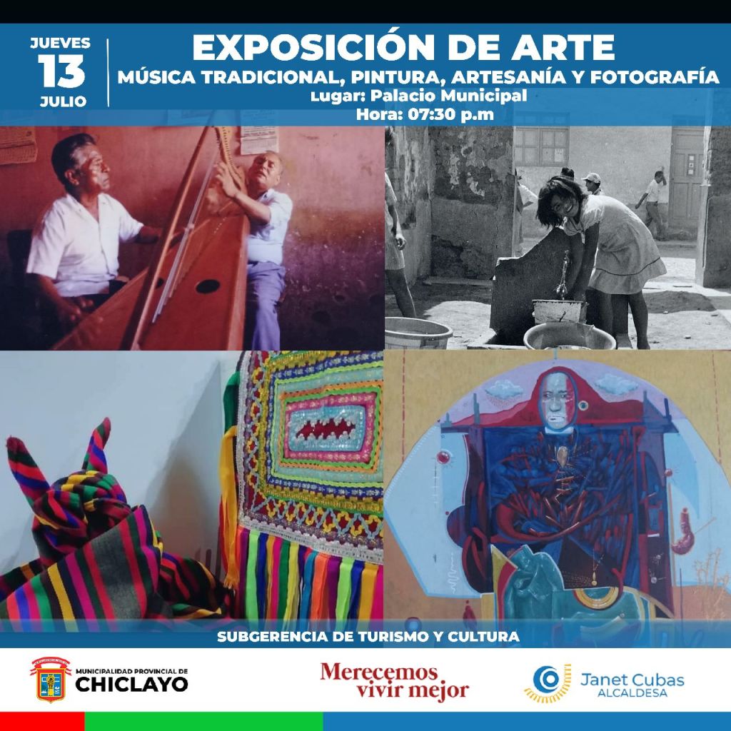En esa perspectiva, este jueves 13 de julio, a las 7:30 pm, en el palacio municipal se inaugura la Exposición de Arte y Cultura Julio 2023, motivo especial en que nuestra principal joya arquitectónica abrirá sus puertas para albergar las valiosas exposiciones que el público chiclayano y los visitantes de diferentes localidades de la región, podrán apreciar y disfrutar.