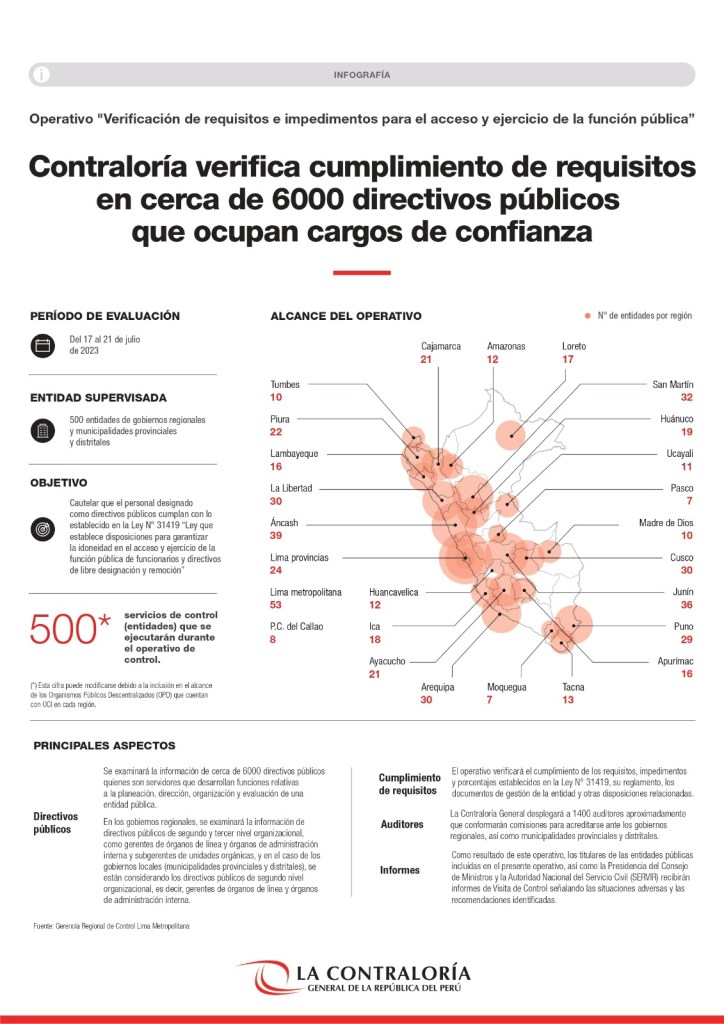 La Contraloría General inició hoy el operativo de control “Verificación de requisitos e impedimentos para el acceso y ejercicio de la función pública” con la finalidad de examinar la información de cerca de 6000 directivos públicos de libre designación y remoción que ocupan actualmente cargos alrededor de 500 entidades de gobiernos regionales y locales (municipalidades provinciales y distritales).
