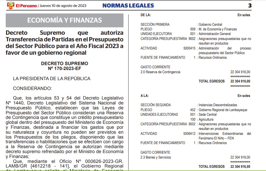 Mediante Decreto Supremo 170 -2023, el Ministerio de Economía y Finanzas autorizó una transferencia de partidas en el Presupuesto del Sector Público para el Año Fiscal 2023, hasta por la suma de 22 304 916,00, a favor del Gobierno Regional de Lambayeque.