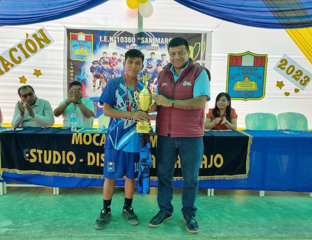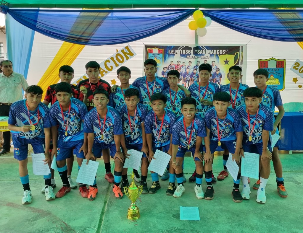 Estudiantes de la I.E. N° 10360 San Marcos, del centro poblado Mocape del distrito de Olmos, fueron condecorados por la UGEL Lambayeque, donde se reconoció a la institución en mención como campeón regional en la disciplina deportiva de fútbol de varones en la categoría C en los Juegos Escolares Deportivos y Paradeportivos (JEDPA) 2023.