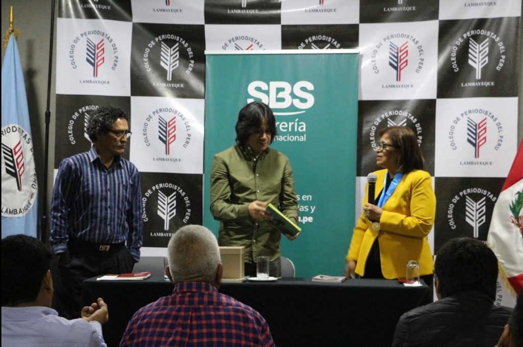 Al final del acto, la decana del Colegio de Periodistas entregó un presente a Christopher Acosta, además de la revista de la Orden y el libro “Azúcar en Lambayeque”, escrito por Rosa Chambergo.