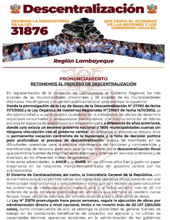 El Gobierno Regional y los alcaldes de Lambayeque expresaron hoy su total rechazo al proceso de descentralización que se viene dando en el país y a la Ley 31876, que regula el proceso de ejecución de obras por administración directa a nivel nacional. Esta ley, aprobada recientemente en el Congreso, limita la labor de las autoridades regionales y locales, debido a que cuando se tenga que ejecutar proyectos con saldos de obras no se podrá hacer por un monto superior a los 250 mil soles.