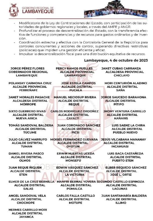 En tal sentido, las autoridades lambayecanas exigen la derogatoria de la Ley que regula las obras por administración directa; modificar la Ley de Contrataciones del Estado, con participación de las autoridades de gobiernos regionales y locales; profundizar el proceso de descentralización, con la transferencia efectiva de funciones, competencias y recursos para gastos ordinarios y de inversión; coordinación estrecha y efectiva con la Contraloría de la República para controles concurrentes y acciones de control, superando directivas restrictivas (policiales) que impiden una gestión eficiente y eficaz; y, finalmente, impulsar la descentralización fiscal para una distribución equitativa de recursos.