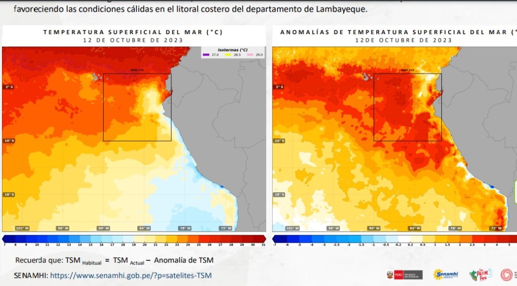 La temperatura de agua del mar registrada durante de manera superficial, promedió valores de 19.0 a 26.0°C en la región de El Niño 1+2, observándose anomalías de hasta +4.0°C con respecto a sus valores normales; lo que favorece las condiciones cálidas en el litoral costero del departamento de Lambayeque.
