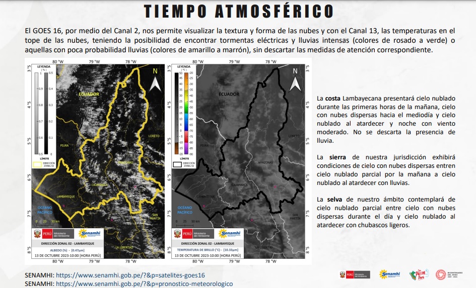El GOES 16, por medio del Canal 2, permite visualizar la textura y forma de las nubes y con el Canal 13, las temperaturas en el tope de las nubes, teniendo la posibilidad de encontrar tormentas eléctricas y lluvias intensas (colores de rosado a verde) o aquellas con poca probabilidad lluvias (colores de amarillo a marrón), sin descartar las medidas de atención correspondiente.