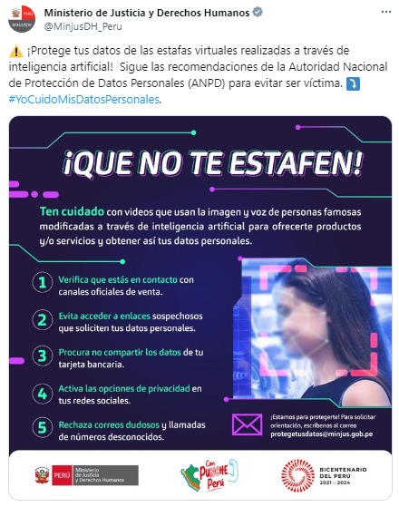 A través de videos e imágenes manipuladas se vienen presentando casos de estafas en redes sociales con la utilización de la Inteligencia Artificial, advirtió la Autoridad Nacional de Protección de Datos Personales (ANPD), del Ministerio de Justicia y Derechos Humanos (MINJUSDH).