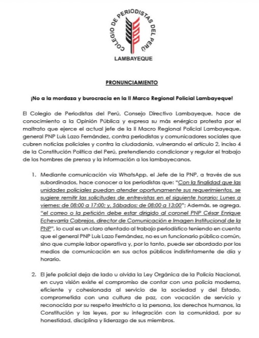 El Colegio de Periodistas del Perú, Consejo Directivo Lambayeque, protestó por el maltrato que ejerce el actual jefe de la II Macro Regional Policial Lambayeque, general PNP Luis Lazo Fernández, al emitir una disposición interna que pretende condicionar a días y horarios el acceso a la información policial, vulnerando el derecho a la libertad de prensa y a la libertad de información de la ciudadanía. En tal sentido, se exhorta la inmediata intervención y pronunciamiento del ministro del Interior, Vicente Romero Fernández, para adoptar las medidas correctivas.