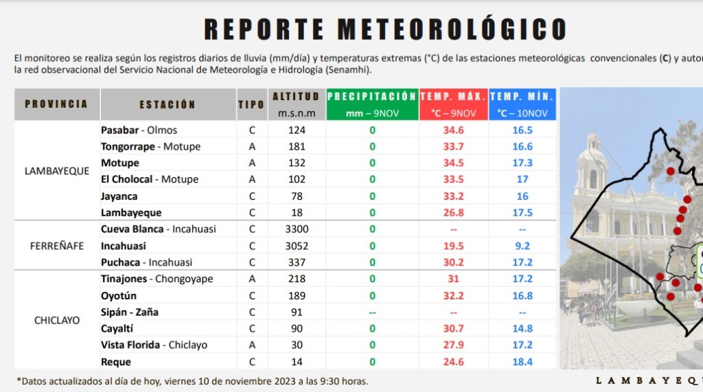 El Senamhi, por intermedio de su Dirección Zonal Lambayeque, monitorea las temperaturas extremas y precipitaciones de manera diaria, permitiendo al usuario observar la distribución espacial, anomalías y la caracterización de las mismas.
