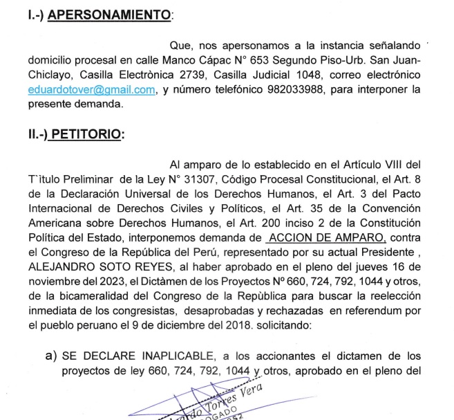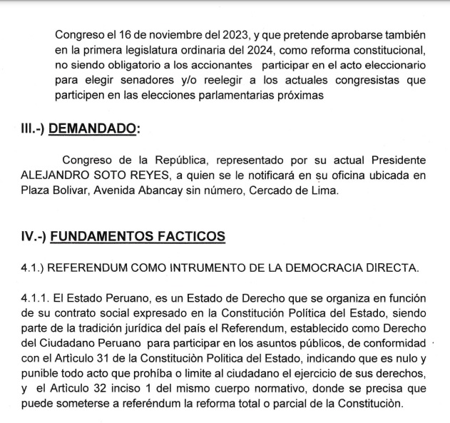 La demanda es contra el Congreso de la República del Perú, representado por su actual presidente, Alejandro Soto Reyes, “al haber aprobado en el pleno del jueves 16 de noviembre del 2023, el Dictamen de los Proyectos Nº 660, 724, 792, 1044 y otros, de la bicameralidad del Congreso de la República para buscar la reelección inmediata de los congresistas, desaprobadas y rechazadas en referéndum por el pueblo peruano el 9 de diciembre del 2018”.