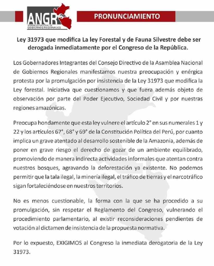 El consejo directivo de la Asamblea Nacional de Gobiernos Regionales (ANGR) expuso en un comunicado su posición contraria a las modificaciones hechas a la Ley Forestal, y pidió que estas sean derogadas. “Exigimos al Congreso la inmediata derogatoria de la Ley 31973”, se indica en el documento.