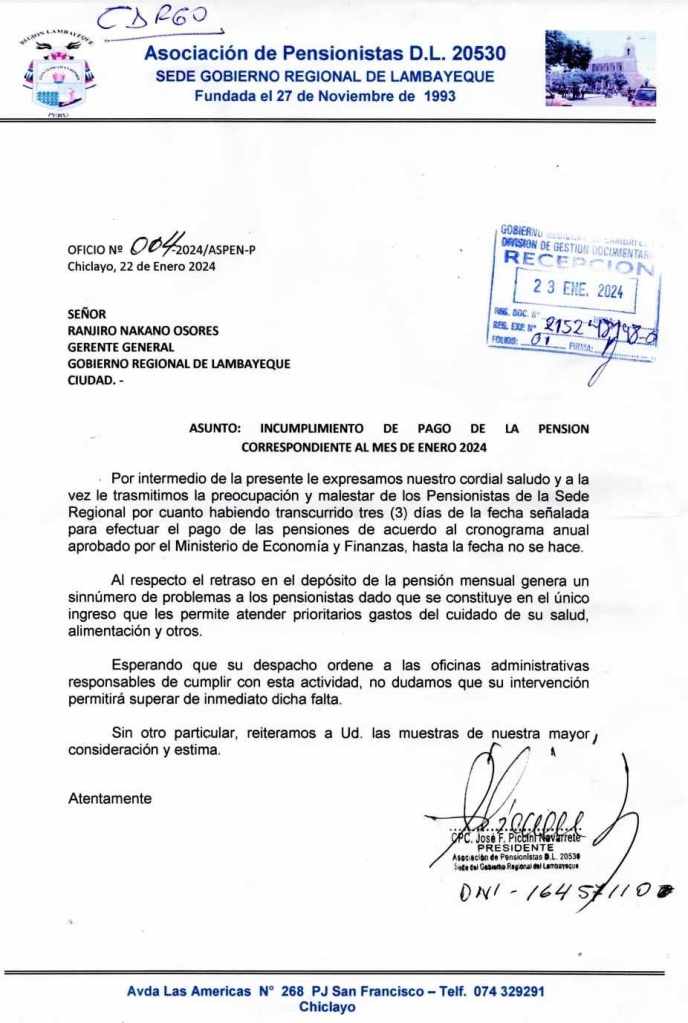 Así se lo hicieron saber al gerente general del Gore, Ranjiro Nakano Osores, a través del oficio 004-20024/ASPEN-P, con el asunto «Incumplimiento de pago de la pensión correspondiente al mes de enero 2024»; en el que transmiten la preocupación y malestar de los pensionistas de la sede regional.