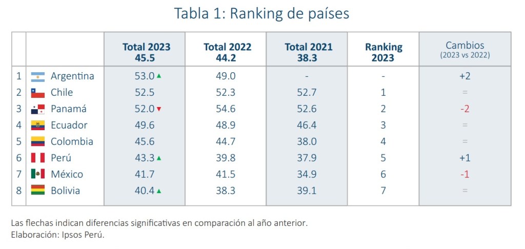 Dentro del ranking regional que proporciona el IIF, Perú se sitúa en el sexto lugar frente a los demás países analizados: Perú, Chile, Bolivia, Colombia, Argentina, Ecuador, Panamá y México. Nuestro país obtuvo un puntaje de 43.3 sobre 100 en el IIF, lo que demuestra que aún nos encontramos por debajo de la media de la región que es del 45.5 puntos.