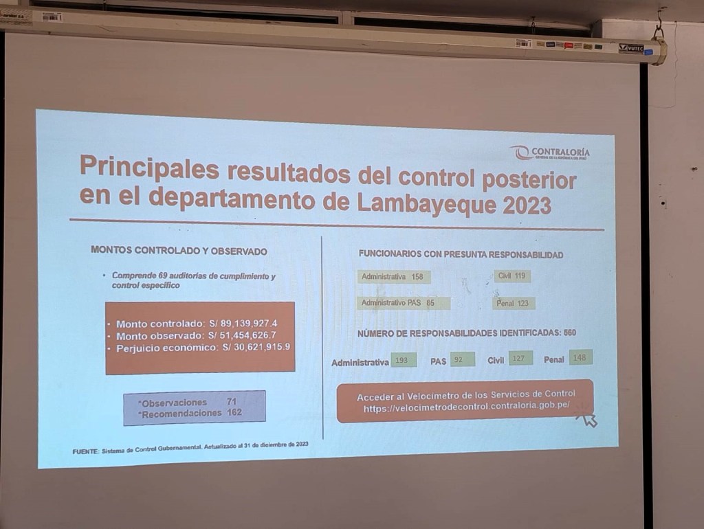 En la presentación del balance de gestión del control gubernamental del año pasado, se informó que la Contraloría General emitió un total de 1 307 informes de control en Lambayeque, de los cuales 332 corresponden al control posterior. Esto incluye 69 auditorías de cumplimiento y servicios de control específico, una auditoría de desempeño, 71 auditorías financieras y 191 acciones de oficio posterior.