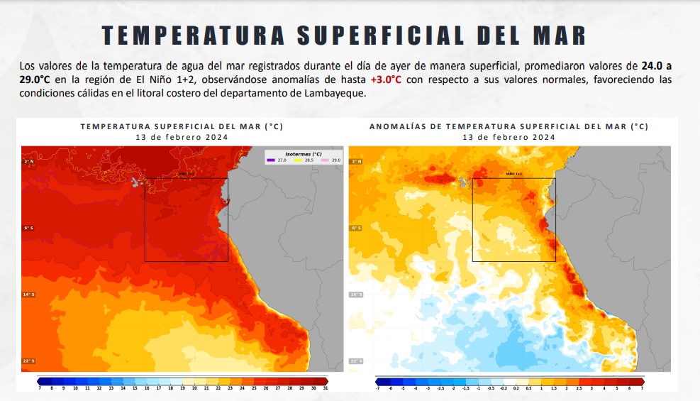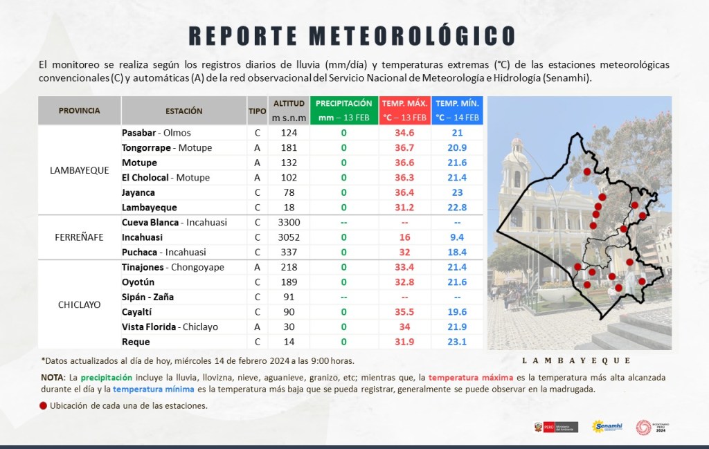 Cuatro zonas del norte de Lambayeque presentan temperaturas que superan los 36 grados centígrados, según el último reporte meteorológico de la red de observaciones del Servicio Nacional de Meteorología e Hidrología-Senamhmi. Se trata de Tongorrape, en Motupe (37.7°C.), Motupe (36.6°C.), El Cholocal, en Motupe (36.3°C.) y Jayanca (36.4°C.). Sin embargo, la mayoría de distritos de la región, la temperatura no baja de los 30°C.