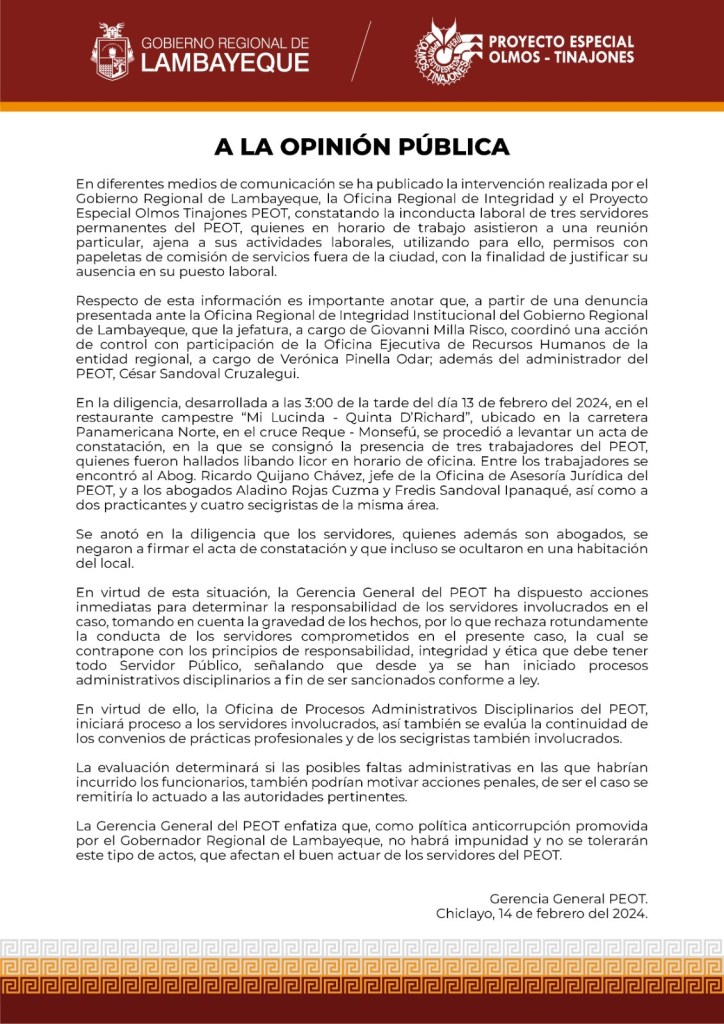 “En diferentes medios de comunicación se ha publicado la intervención realizada por el Gobierno Regional de Lambayeque, la Oficina Regional de Integridad y el Proyecto Especial Olmos Tinajones PEOT, constatando la inconducta laboral de tres servidores permanentes del PEOT, quienes en horario de trabajo asistieron a una reunión particular, ajena a sus actividades laborales, utilizando para ello, permisos con papeletas de comisión de servicios fuera de la ciudad, con la finalidad de justificar su ausencia en su puesto laboral.