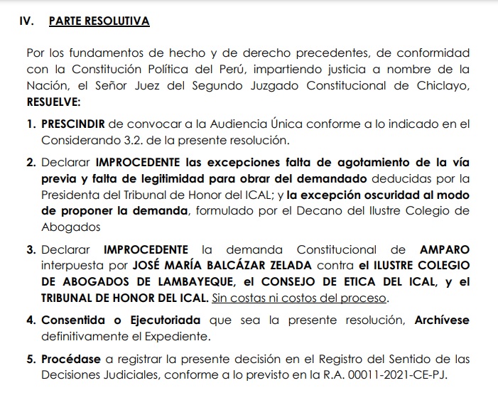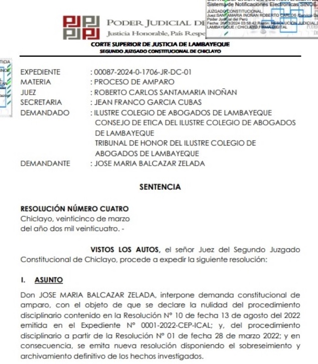 El Segundo Juzgado Constitucional de Chiclayo, a cargo del juez Roberto Carlos Santamaría Inoñán, ha resuelto declarar improcedente la demanda Constitucional de Amparo interpuesta por José María Balcázar Zelada contra el Ilustre Colegio de Abogados de Lambayeque, El Consejo de Ética del ICAL y el tribunal de Honor del ICAL, mediante la resolución número cuatro, de fecha 25-03-2024. Demanda que obra en el expediente 00087-2024-0-1706-JR-DC-01.