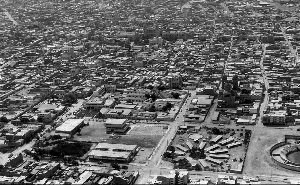 Centro Cívico de Chiclayo. Edificios de Correos, Biblioteca Municipal y Sunat. Después allí se construyeron el Banco de la Nación, el Poder Judicial y el Ministerio Público. A la derecha, el campo del que iría a ser la Casa Comunal de la Juventud y parte de la Plaza de Toros de Chiclayo.