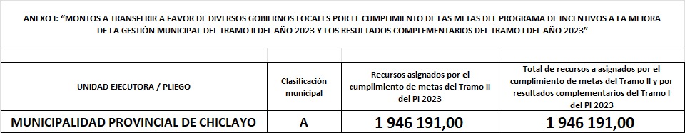 De este último monto, corresponde transferir a la Municipalidad de Chiclayo un incentivo económico de un millón 946, 191.00 soles en el marco del Programa de Incentivos a la mejora de la Gestión Municipal por el cumplimiento de metas del tramo II del año 2023 y resultados complementarios del tramo I del año 2023.