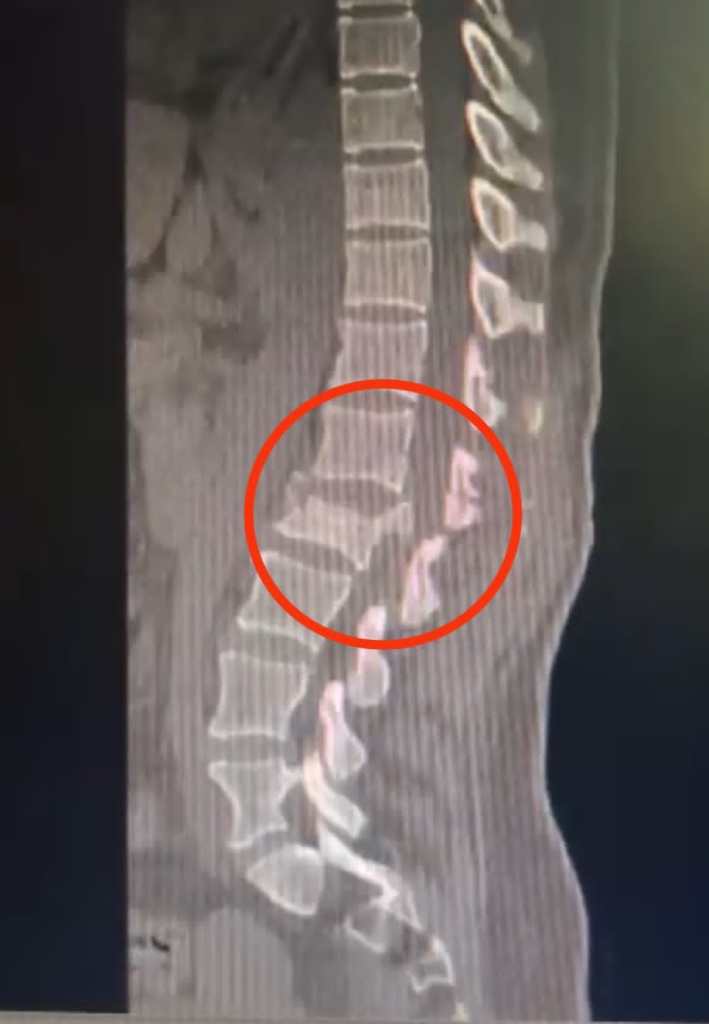 El jefe del servicio de neurocirugía de dicho nosocomio, Dr. Yuri Valdivieso Villena, indicó que la paciente llegó con contusiones múltiples e inmovilidad en ambas piernas. De manera inmediata se le realizó diversos exámenes que evidenció una fractura compleja en la segunda vértebra lumbar con un fragmento de hueso, que ingresó al canal medular con compromiso de los nervios y en los miembros inferiores de su cuerpo.