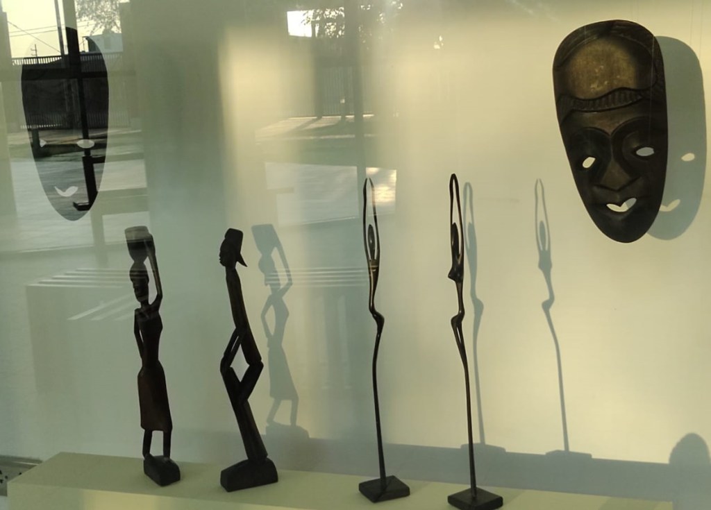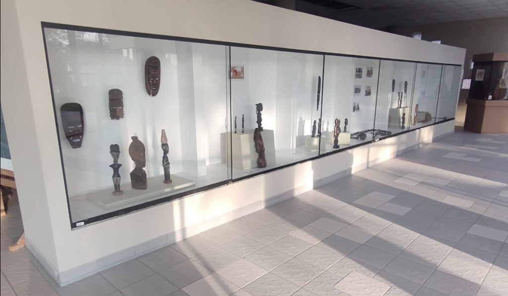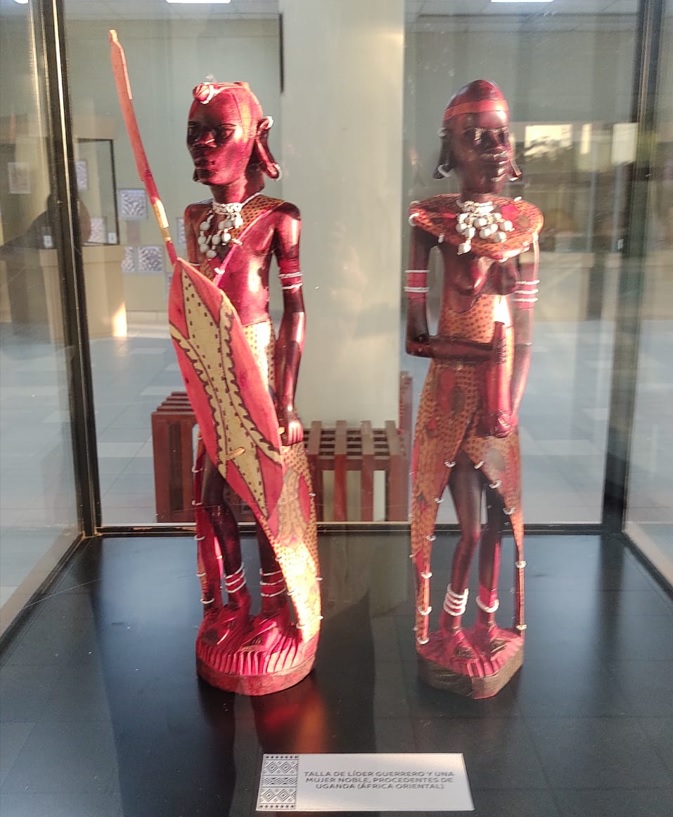 Se puede apreciar en la exposición un guion ágil y didáctico, donde en la primera vitrina expone un guerrero junto a una mujer noble, procedente de Uganda – África, magistralmente tallada en madera y con ornamentos que realzan estéticamente a estos personajes.