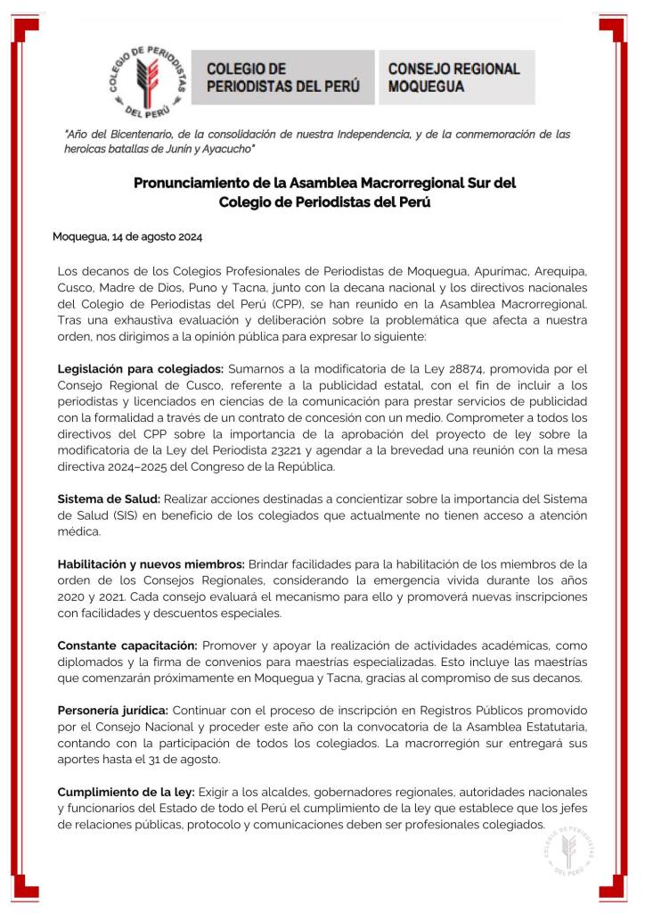 El pronunciamiento es firmado por Karola Lara Manchego, decana nacional del CPP; así como los decanos Pamela Indira Blas Castro, de la Región Moquegua; Eland Dick Vera Vera, de Puno; José María Gómez Rumiche, de Tacna; Héctor Jorge Mayhuire Rodríguez, de Arequipa; Mario Ramos Anampa, de Apurímac; Carlos Cuaresma Sánchez, de Cusco y David Mejía Huamán, de la Región Madre de Dios.