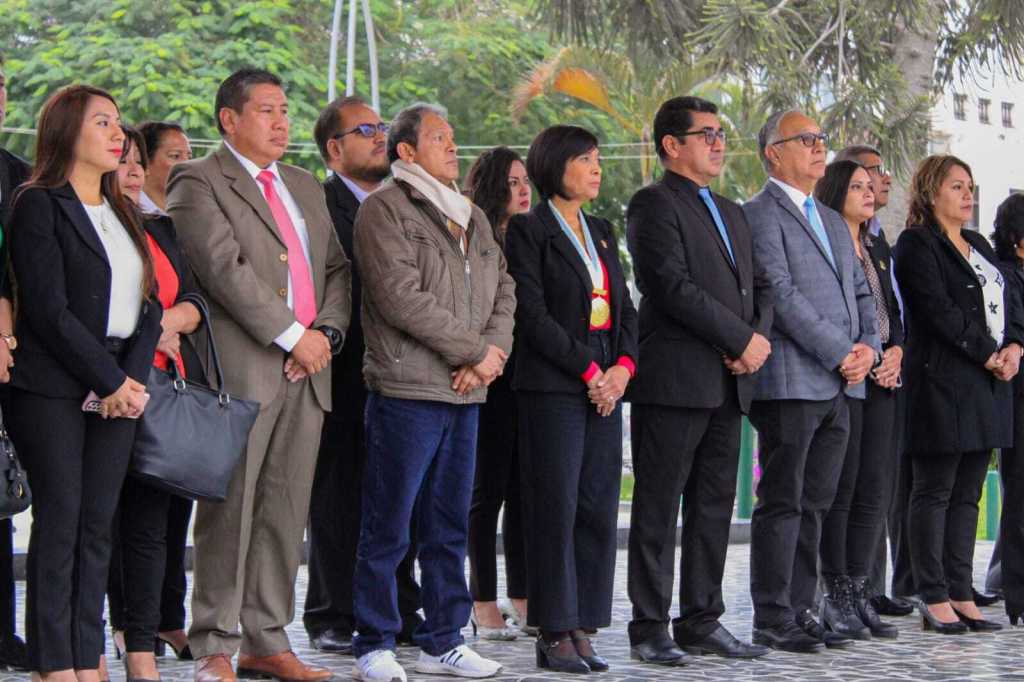 La ceremonia se inició con el izamiento del pabellón nacional a cargo de la alcaldesa y el gerente municipal Carlos Paredes; luego izamiento de la bandera de la región Lambayeque y la Bandera de Chiclayo con la entonación de los respectivos himnos.