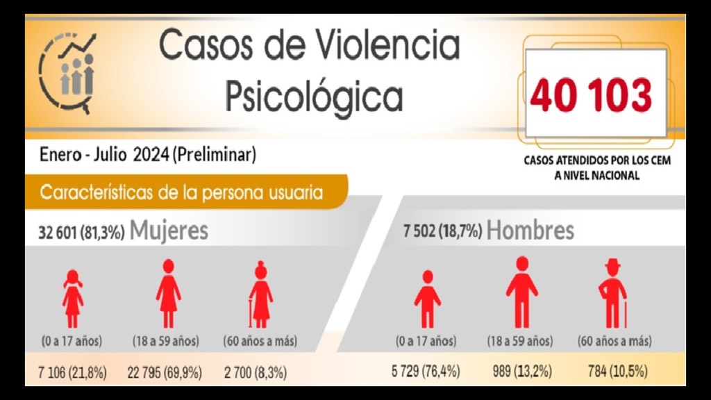 Dio a conocer que, de esos totales, las mujeres violentadas físicamente son 30,610 (84.5%); sexualmente 16,540 (93,6%); y violentadas psicológicamente 32,601 (81.3%). En ese mismo nivel figuran los hombres, cuya cifra asciende a 7,502 (18.7%) en el primer caso; 1,130 (6.4%), en el segundo y 7,502 (18,7%) en el tercero.