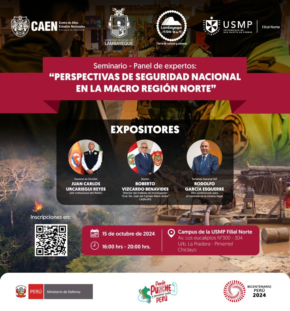 De esta manera, en el norte del Perú, como en el resto del territorio, se vienen tomando acciones para combatir estos problemas que afectan a todos los peruanos. Para contribuir a esta lucha, el Gobierno Regional de Lambayeque, el Centro de Altos Estudios Nacionales CAEN, a través de su Instituto de Investigación “General José Del Carmen Marín”, y la Universidad de San Martín de Porres USMP filial Norte, realizarán el Seminario – Panel de Expertos: “Perspectivas de Seguridad Nacional en la Macro Región Norte” el próximo 15 de octubre.