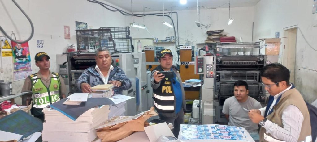 Durante un operativo conjunto, se intervino el establecimiento Marlo Graf E.I.R.L, ubicado en la calle Vicente de la Vega 982, en el centro de Chiclayo. En la intervención, se hallaron documentos membretados que se presumen adulterados, los cuales correspondían a diversas entidades públicas y empresas privadas. El negocio no contaba con la autorización requerida para realizar tales actividades, lo que constituye un delito contra la propiedad intelectual.