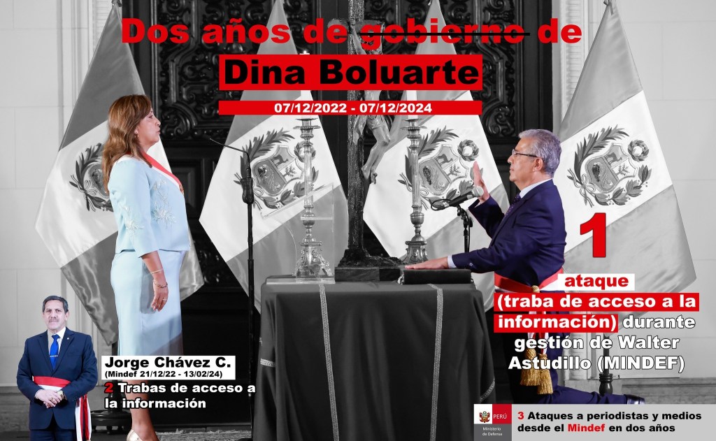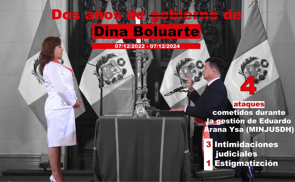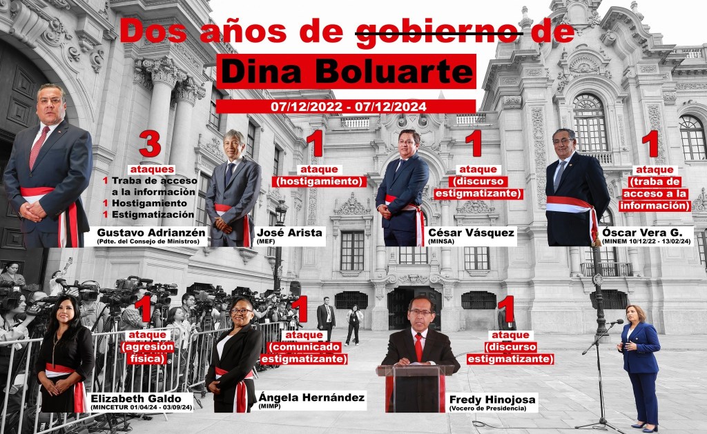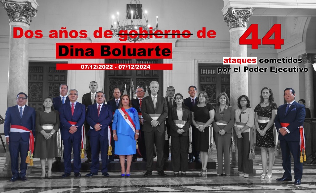 El Poder Ejecutivo acumuló 44 casos de agresión a periodistas durante estos dos años. La propia presidenta Boluarte ha protagonizado episodios de confrontación, como el 18 de setiembre de 2023, cuando calificó de «agresiva» a la periodista Angélica Valdés tras una reunión en Nueva York. En noviembre de 2023, criticó un reportaje de Cuarto Poder que revelaba reuniones secretas de su hermano Nicanor Boluarte, quien ahora se encuentra prófugo de la justicia, calificándolo de difamatorio.