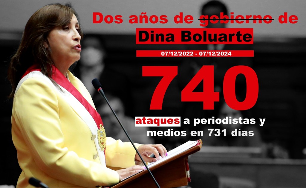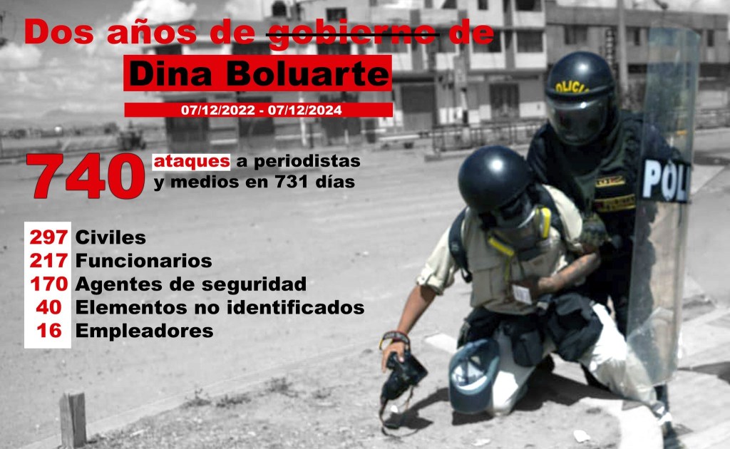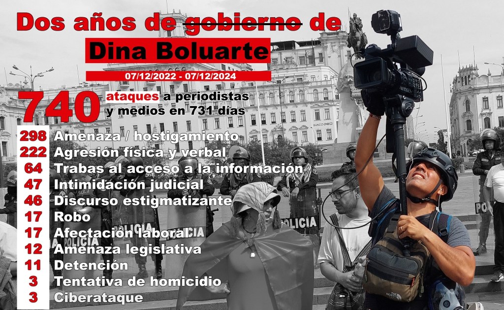 Entre el 7 de diciembre de 2022 -fecha en que inició la gestión de Dina Boluarte- y el 7 de diciembre de 2024, la prensa peruana ha enfrentado un total de 740 ataques, según el registro de la Oficina de Derechos Humanos de la Asociación Nacional de Periodistas del Perú (ANP).