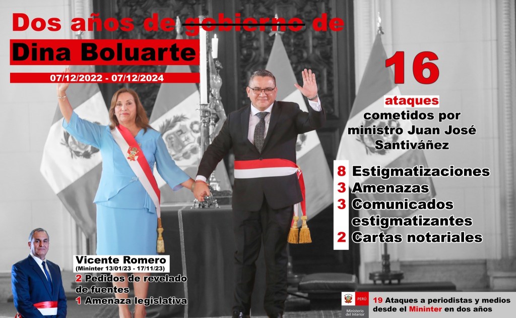 El ministro Juan José Santiváñez ha registrado al menos 16 incidentes de ataques, entre los que destacan estigmatizaciones y amenazas, desde que asumió el cargo el 16 de mayo del 2024. Entre ellos, calificó de «fracasado» al periodista Marco Sifuentes y amenazó con iniciar acciones legales contra Ricardo Velazco y César Hildebrandt.